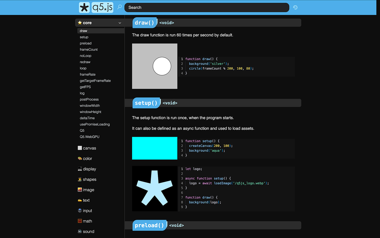 q5’s documentation offers concise descriptions and mini examples. Instead of separate pages for every function with examples written as if they were standalone demos, related functionality is grouped into scrollable sections. The “show don’t tell” approach to presenting information in sequence enables more natural learning.